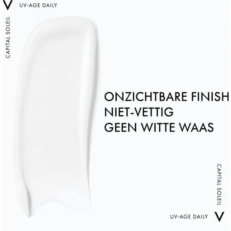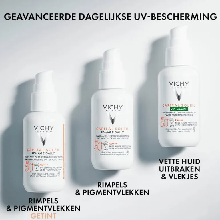 De Capital Soleil SPF50+ UV-Age Zonnefluide van Vichy combineert een dagelijkse UV-bescherming met een anti-aging werking. Het beschermt het gelaat optimaal tegen UV-A/UV-B-stralen en gaat tegelijk de zichtbare tekenen van huidveroudering door de zon (zoals pigmentvlekken en rimpels) tegen.