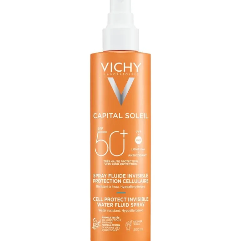 Vichy Capital Soleil Cell Protect Fluïde Spray SPF50+ biedt geavanceerde bescherming op vier niveaus (UVB, UVA, lange UVA en antioxidanten) om schadelijke effecten van de zon te helpen voorkomen. De ultralichte formule met de gepatenteerde* Netlock-technologie vormt een geavanceerde beschermende UV-laag met een onzichtbare finish en zonder witte strepen.