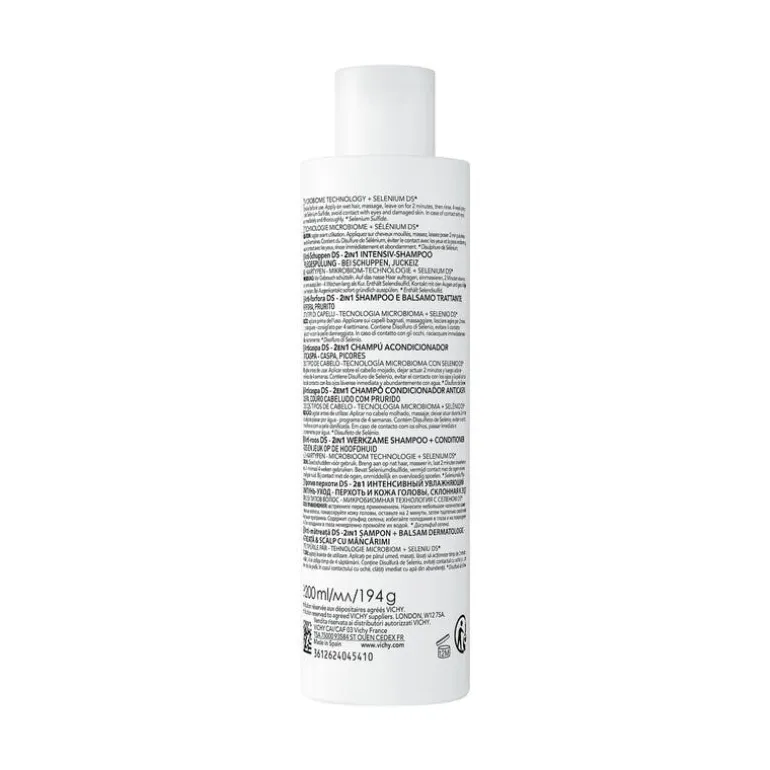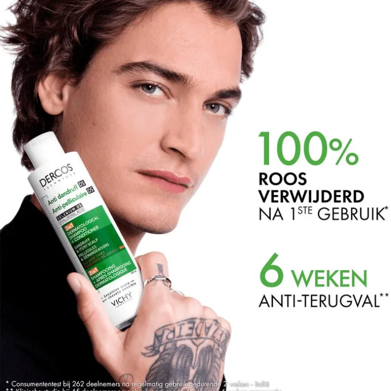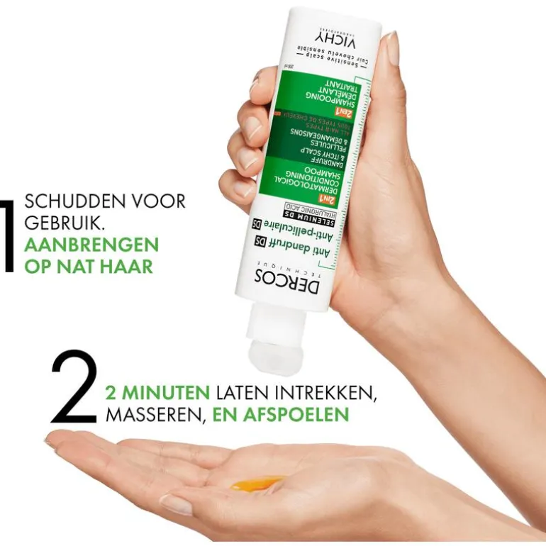 Vichy Dercos Technique 2-in-1 Anti-roos Shampoo + Conditioner combineert een anti-roos en anti-jeuk werking met een hydraterende verzorging die het haar helpt te ontwarren. Het is zowel een verzorgende shampoo als een ontwarrende conditioner die de hoofdhuid zacht en glanzend maakt. Het bevat seleniumdisulfide, een actief ingrediënt dat van bij het eerste gebruik roos verwijdert en terugkeer voorkomt. Het microbioom wordt terug in evenwicht gebracht, waardoor het probleem bij de bron wordt aangepakt. Hyaluronzuur zorgt voor een diepe hydratatie. Het haar is zachter en gemakkelijker te ontwarren.