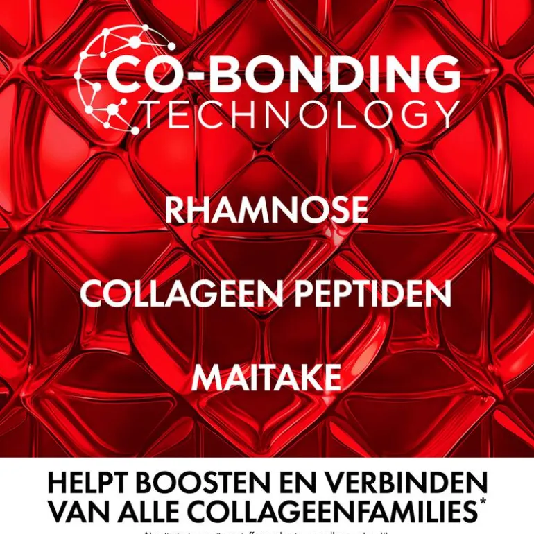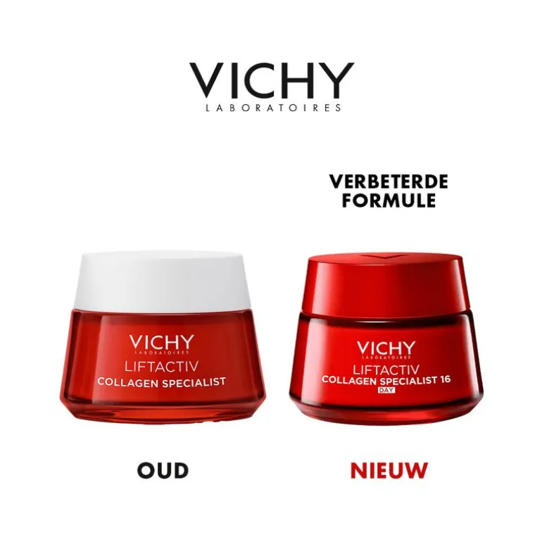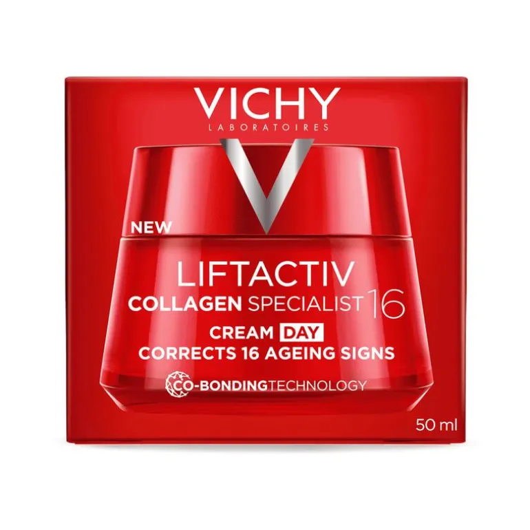 Naarmate je ouder wordt, begint de collageenproductie af te nemen. Dit versnelt tekenen van huidveroudering, vooral rondom de ogen. De vernieuwde Liftactiv Collagen 16 Dagcrème, ontwikkeld door de experts van Vichy, helpt 16 tekenen van huidveroudering* bestrijden, dankzij de innovatieve en unieke Co-Bonding Technologie: wallen, donkere kringen, rimpels onder de ogen, onzuiverheden, fijne lijntjes, stevigheid, huidverslapping, soepelheid, huidtextuur, tekenen van vermoeidheid, toniciteit, veerkracht, glans, elasticiteit, hydratatie, gelijkmatigheid.