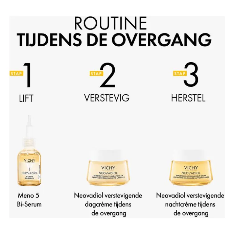 Op basis van nieuwe inzichten zijn de crèmes van Neovadiol vernieuwd met een verbeterde formule voor een optimale effectiviteit tegen zichtbare tekenen van de overgang, maar met de vertrouwde textuur en geur!