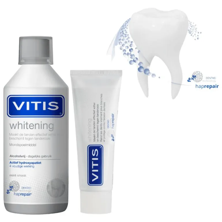De kracht van VITIS Whitening Tandpasta zit in de revolutionaire Dentaid HAPrepair Technologie met unieke 5-voudige werking. Minuscule deeltjes van actief hydroxyapatite hechten zich aan het tandoppervlak. Door hun grootte kunnen deze deeltjes volledig in het glazuur worden opgenomen. Hierdoor worden barstjes en onregelmatigheden in het tandoppervlak opgevuld. Tanden en kiezen voelen gladder, gaan glanzen en krijgen hun natuurlijke witte kleur terug. Spoel niet na met water, maar met VITIS Whitening Mondspoeling zodat de werkzame stoffen in de mond blijven, voor een maximaal resultaat. VITIS Whitening is zeer geschikt voor dagelijks gebruik, dankzij het ontbreken van peroxiden of schurende bestanddelen.