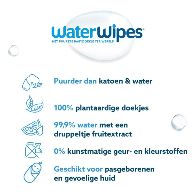 WaterWipes zijn de enige billendoekjes die alleen 99.9% water en een druppeltje fruitextract bevatten én plasticvrij zijn. We zijn dan ook het meest aanbevolen babydoekjes merk door kraamverzorgenden in Nederland. Nog steeds even puur en vriendelijk voor zelfs de meest gevoelige huid, maar nu vriendelijker voor het milieu. Wil je meer weten over WaterWipes, bezoek dan onze website www.waterwipes.nl.