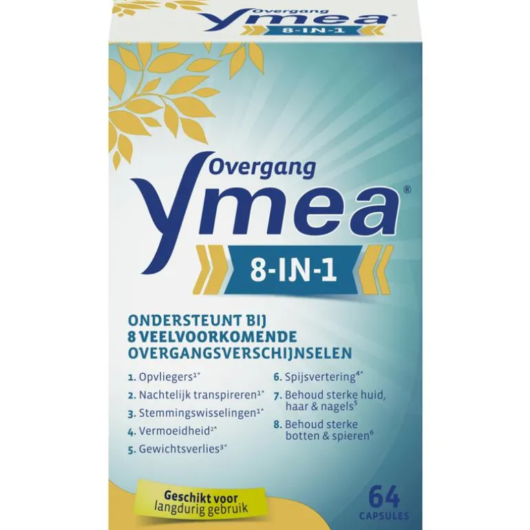 Ymea 8-1 overgangstabletten ondersteunt bij wel 8 veelvoorkomende overgangsverschijnselen. Als gevolg van schommelingen in de hormoonspiegel kunnen vrouwen in de overgang verschillende verschijnselen ervaren, zowel fysiek als mentaal. Ymea 8-in-1 is een uitgebreide formule, speciaal afgestemd om ondersteuning te bieden aan vrouwen tijdens de overgang. De innovatieve samenstelling helpt bij opvliegers, nachtelijk transpireren en stemmingswisselingen¹. Daarnaast draagt het bij aan extra energie bij vermoeidheid², gewichtsverlies³ en het behoud van een gezonde spijsvertering⁴. Ymea 8-in-1, een uitgebreide formule die bijdraagt aan een comfortabele overgang.Ymea 8-in-1 helpt bij 8 veelvoorkomende overgangsverschijnselen.