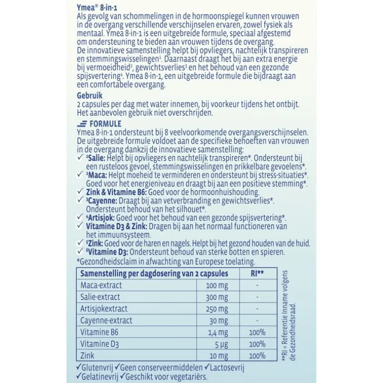 2 capsules per dag met water innemen, bij voorkeur tijdens het ontbijt. Het aanbevolen gebruik niet overschrijden. Ymea 8-in-1 is een voedingssupplement met een combinatie van vitamines, mineralen en natuurlijke extracten. Een gezonde levensstijl is belangrijk, evenals een gevarieerde, evenwichtige voeding, waarvoor voedingssupplementen geen vervanging zijn.