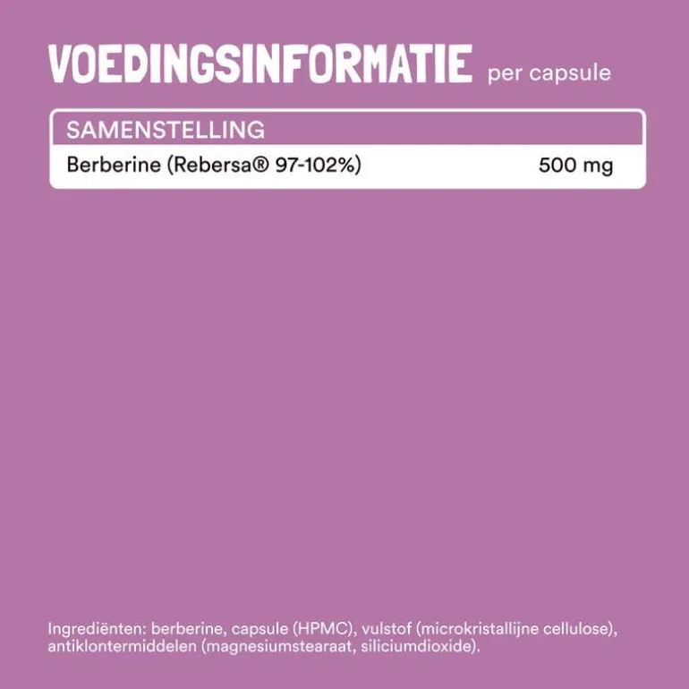 Ingrediënten: berberine, capsule (HPMC), vulstof (microkristallijne cellulose), antiklontermiddelen (magnesiumstearaat, siliciumdioxide)