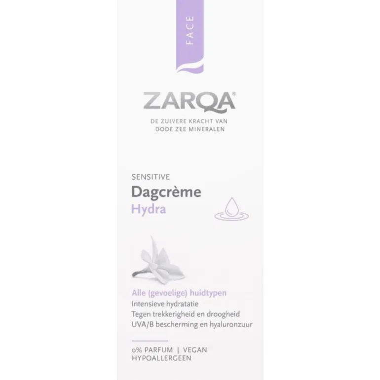 Zarqa Dagcrème Hydra met hyaluronzuur geeft een krachtige vochtboost en is in het bijzonder geschikt voor de vochtarme huid. De luchtige, frisse crème voelt prettig aan op de huid en beschermt dankzij Dode Zee-algen opgelost in jojobaolie actief tegen vroegtijdige huidveroudering door schadelijke invloeden van buitenaf, zoals UV-straling. Door de beschermende werking worden pigmentvlekken voorkomen en is de kans op fijne lijntjes en rimpels kleiner. Kalmeert de huid en maakt deze soepel en zacht. Geschikt voor alle huidtypen, zelfs de meest gevoelige.