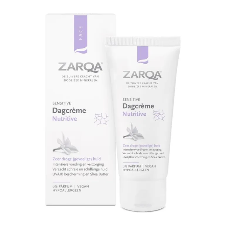 Zarqa Dagcrème Nutritive biedt intensieve voeding door de toevoeging van verzachtende, beschermende en hydraterende shea butter, macademiaolie en vitamine E. De Dode Zeemineralen en hyaluronzuur gaan uitdroging tegen en zorgen ervoor dat ruwe, schrale plekjes geen kans krijgen. Dagcrème Nutritive beschermt tegen schadelijke invloeden van buitenaf, zoals UV-straling, en maak de huid zacht en soepel. Geschikt voor alle huidtypen, in het bijzonder de (zeer) droge. Ook geschikt voor de meest gevoelige huidtypen.