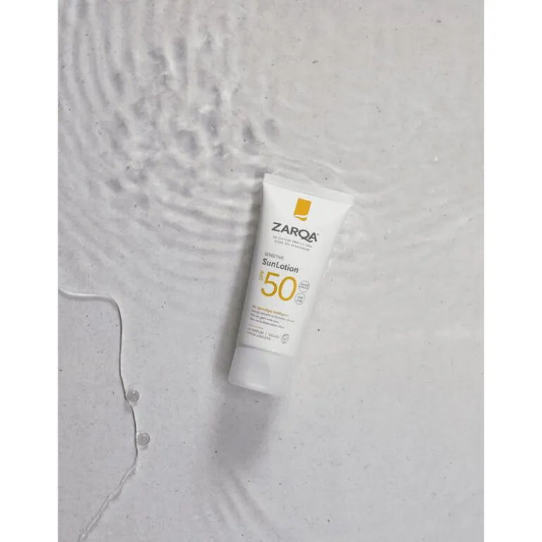 ZARQA SunLotion SPF50 – met huid- en milieuvriendelijke UVA/UVB filters – is zonbescherming met zeer hoge spf voor intensieve bescherming van zelfs de meest gevoelige huid. De parfumvrije en waterbestendige formule smeert prettig, trekt snel in, plakt niet en laat geen witte waas achter. De lotion is zo mild dat deze gebruikt kan worden bij een zon- en allergie- gevoelige huid, en helpen bij het kalmeren van een geïriteerde huid. Voor het hele gezin.