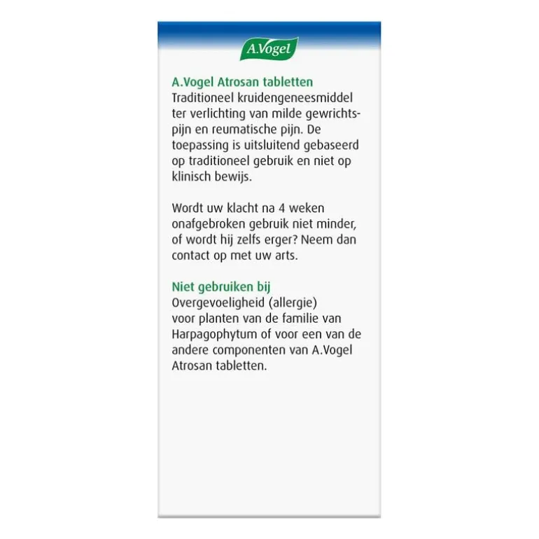 Pijnlijke gewrichten? Atrosan tabletten van A.Vogel is een natuurlijke pijnstiller bij milde gewrichtspijn en reumatische pijn, zoals door artrose of artritis. Atrosan bevat 480mg Harpagophytum (Duivelsklauw).