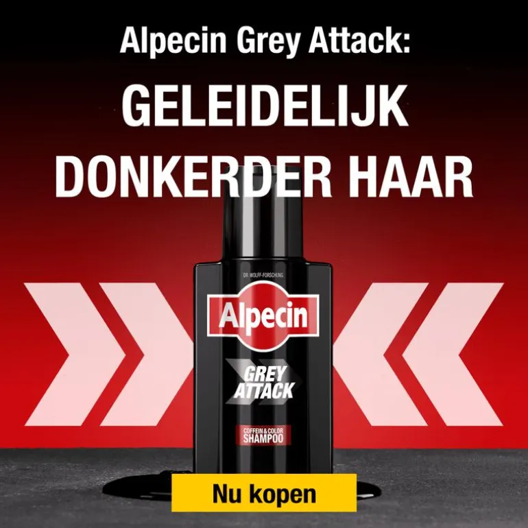 Alpecin Grey Attack. De eerste shampoo met innovatieve re-pigmentatie technologie voor geleidelijk donkerder haar, welke langdurig werkt. Het geeft een natuurlijk ogend kleureffect voor (eerste) grijze haren. Eenvoudig te gebruiken shampoo met slechts 2-5 min. inwerktijd. De intensiteit van de kleur wordt bepaald door de inwerktijd en gebruiksfrequentie. Met cafeïnecomplex dat de haargroei versterkt.