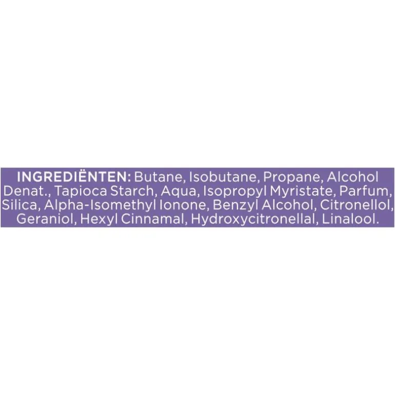 Butane, Isobutane, Propane, Alcohol Denat., Tapioca Starch, Aqua, Isopropyl Myristate, Parfum, Silica, Alpha-Isomethyl Ionone, Benzyl Alcohol, Citronellol, Geraniol, Hexyl Cinnamal, Hydroxycitronellal, Linalool.