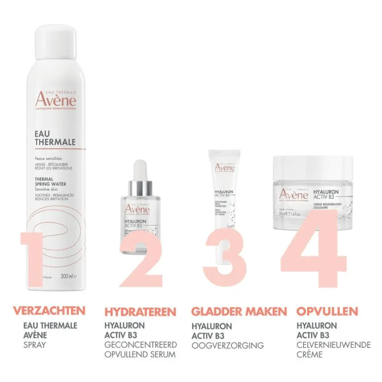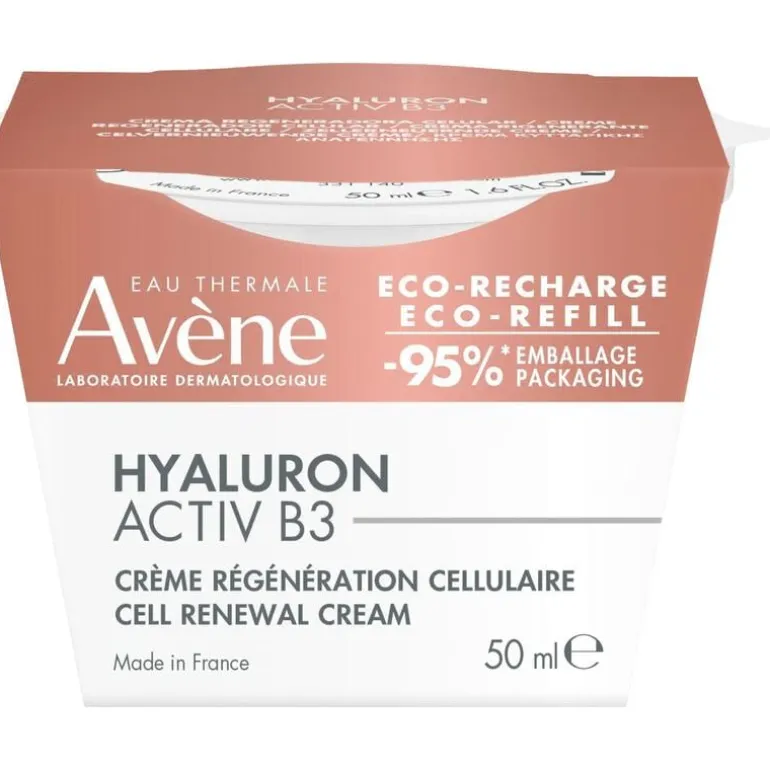 Met de leeftijd gaat alles sneller. De cellen worden ouder en de huid gaat trager werken. Daarom hebben de dermatologische laboratoria van Avène de geconcentreerde crème Hyaluron Activ B3 ontwikkeld, met 0,2 % zuiver hyaluronzuur (met hoge en lage moleculaire massa) en 6 % niacinamide. Deze ingrediënten werken in op de oorzaak van veroudering en verlengen de levensduur van de cellen*. Al na het eerste gebruik ziet de huid er voller en gladder uit en krijgt deze een stralende gloed. Na 15 dagen is de huid geregenereerd: ze voelt steviger aan en heeft minder rimpels. De fluweelzachte textuur met subtiel parfum voelt aangenaam aan op de huid. Bovendien is de crème een uitstekende make-upbasis. De celvernieuwende crème Hyaluron Activ B3 is een milieuvriendelijk verzorgingsproduct met 92 % ingrediënten van natuurlijke oorsprong en zonder ingrediënten van dierlijke oorsprong.