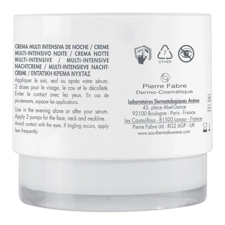 AVENE THERMAL SPRING WATER (AVENE AQUA). CAPRYLIC/CAPRIC TRIGLYCERIDE. GLYCERIN. SQUALANE. BUTYROSPERMUM PARKII (SHEA) BUTTER (BUTYROSPERMUM PARKII BUTTER). CARTHAMUS TINCTORIUS (SAFFLOWER) SEED OIL (CARTHAMUS TINCTORIUS SEED OIL). PENTAERYTHRITYL TETRACAPRYLATE/TETRACAPRATE. CETEARYL ALCOHOL. BEHENYL ALCOHOL. NIACINAMIDE. C20-22 ALKYL PHOSPHATE. C20-22 ALCOHOLS. RETINAL. SODIUM HYALURONATE. TERMINALIA CHEBULA FRUIT EXTRACT. ADENOSINE. ACACIA SENEGAL GUM. CETEARYL GLUCOSIDE. FRAGRANCE (PARFUM). HELIANTHUS ANNUUS (SUNFLOWER) SEED OIL (HELIANTHUS ANNUUS SEED OIL). RED 33 (CI 17200). SODIUM BENZOATE. SODIUM HYDROXIDE. TOCOPHEROL. TOCOPHERYL GLUCOSIDE. WATER (AQUA). XANTHAN GUM