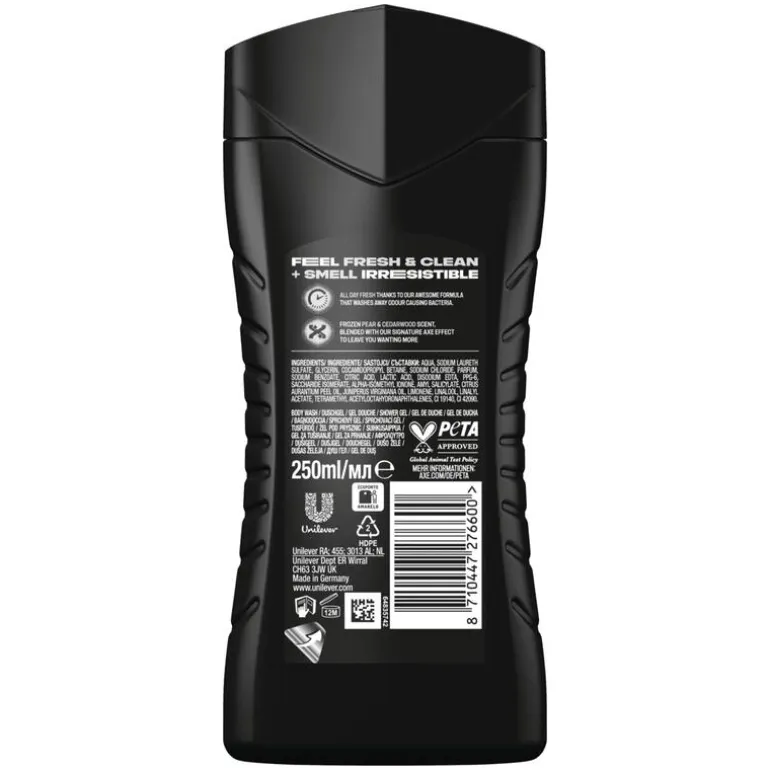 AXE Black 3-in-1 Douchegel met de verfijnde en subtiele geur van bevroren peer en cederhout. Voel je fris en ruik wel 12 uur lang onweerstaanbaar.