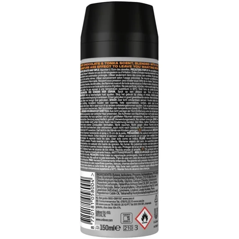 De AXE Dark Temptation Anti-Transpirant Spray garandeert langdurig droge oksels. Dus het maakt niet uit wie er op je pad komt, je bent er 100% klaar voor. Bovendien krijg je die onweerstaanbare geur van chocolade met een vleugje kruiden waardoor je frisser bent, de hele dag door. Dezelfde opwindende AXE Dark Temptation-geur met een vernieuwde, frisse nieuwe look. Maar wat erin zit, doet er ook toe. Onze formule houdt je oksels droog en superfris en geeft je tot wel 72 uur lang bescherming tegen zweet. De hele dag, de hele nacht – wat er ook gebeurt. Je voelt je fris, droog en op je best, waar en wanneer je maar wilt.