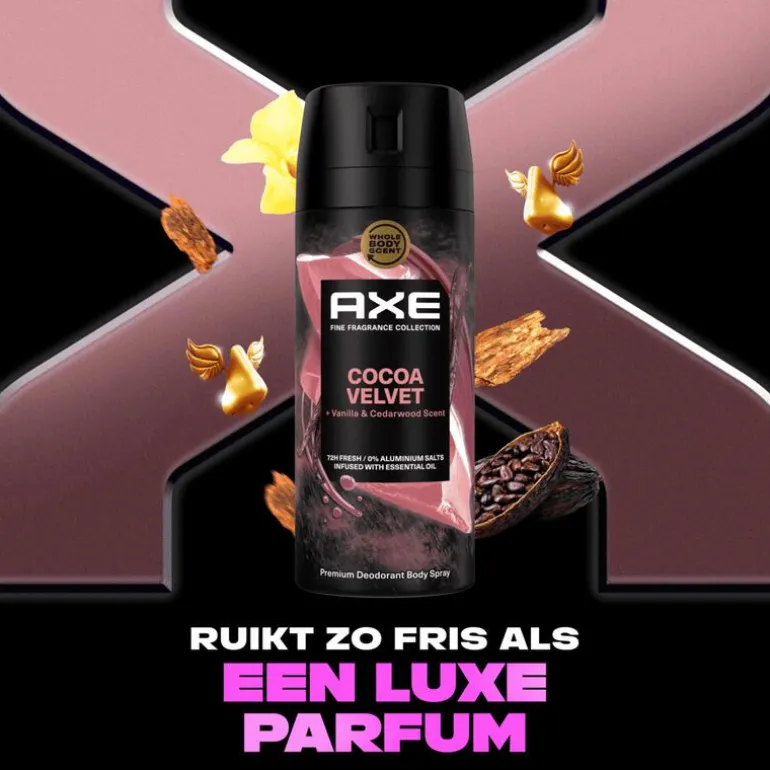 AXE Fine Fragrance Collection Cocoa Velvet Premium Deodorant Bodyspray met de geur van vanille en cederhout ruikt als een luxe parfum en beschermt effectief als een deo.