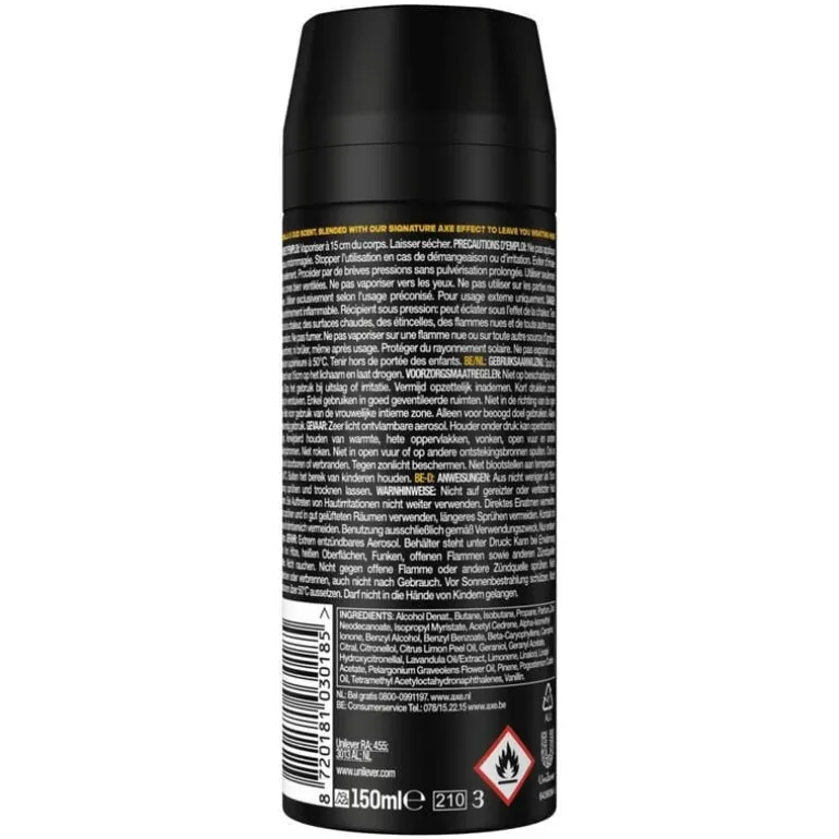 Ruik onweerstaanbaar fris met AXE Gold Deodorant Bodyspray. Leef het dagelijkse frisse leven. Je weet nooit wat er kan gebeuren, dus heb je een bodyspray nodig om de hele dag heerlijk te blijven ruiken. AXE Gold Deodorant Bodyspray met geurbestrijdende zink, verhoogd met 5% Zink-Zap technologie, stopt ongewenste lichaamsgeur en geeft je langdurige bescherming. Geniet 48 uur lang van de stijlvolle geur van oud wood en donkere vanille. Wat er ook op je pad komt, met AXE ben je er klaar voor. De hele dag door.