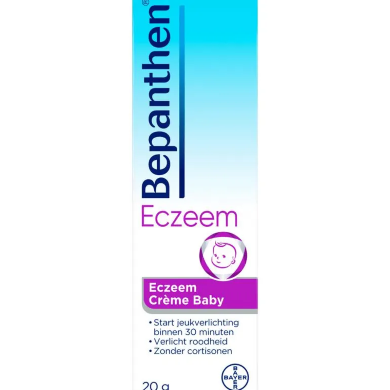 Bepanthen Eczeem Crème is er ook voor de allerkleinsten (te gebruiken vanaf de geboorte) en verkrijgbaar in een kleine variant van 20 gram in het babyschap en online. Bepanthen Eczeem Crème bevat geen cortisonen (hormonen), parfum en parabenen. Bepanthen Eczeem Crème verlicht effectief jeuk en roodheid bij licht tot matig eczeem op de babyhuid. Daarnaast ondersteunt Bepanthen Eczeem Crème het huidherstel* bij huidirritatie, zoals eczeem of een allergische reactie op de babyhuid.Vochtregulerende stoffen zoals glycerine hydrateren de babyhuid en de speciale lamellaire-lipiden technologie herstelt de huidbarrière tussen eczeemuitbraken door bij een eczeemgevoelige en droge babyhuid. Eczeem baby, baby eczeem.Eczeem Crème (eczeemcreme) vs Eczeem Zalf (eczeemzalf)In een enkel geval reageert de eczeem plek niet goed op de crème en heeft de plek een vettere zalf nodig. Dit gebeurt bij de zeer droge variant van eczeem. Een echte uitbraak van eczeem kan het beste met een hormoon zalf (die wordt voorgeschreven door uw dokter) behandeld worden. Voor tussendoor is de Bepanthen Beschermende Zalf een prima uitkomst bij de zeer droge variant van eczeem, bijvoorbeeld bij zeer droge handen.*Bepanthen bevat dexpanthenol. Deze stof heeft de bekende eigenschap het huidherstel te ondersteunen.Bepanthen Eczeem Crème is een medisch hulpmiddel. Lees voor gebruik de gebruiksaanwijzing.