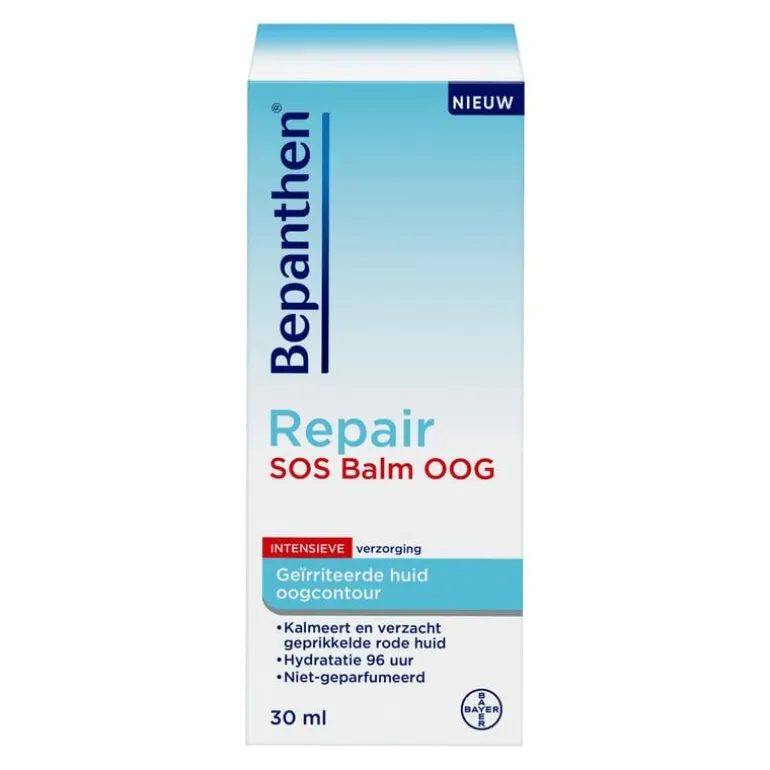 De huid rond je ogen is extra gevoelig en reageert snel op invloeden van buitenaf. Rode huid, een licht prikkend gevoel of een lichte zwelling, bijvoorbeeld na het dragen van make-up, als het warmer of kouder wordt buiten of na een lange stressvolle dag, zijn daar vervelende tekenen van. Bepanthen Repair SOS Balm Oog is speciaal ontwikkeld om de gevoelige huid rond de oogen te kalmeren, te verzachten en te verkoelen. De rijke balsem blijft goed zitten en trekt snel in, zonder een vet laagje achter te laten. De formule kalmeert, hydrateert en helpt de huid te herstellen dankzij ingrediënten zoals dexpanthenol, niacinamide (vitamine B3), sheaboter en arganolie. Zo geef je je ogen weer de frisse, verzorgde uitstraling die ze verdienen. •Kalmeert en verkoelt direct de geprikkelde rode huid rond je ogen •Helpt de huid te herstellen •Hydrateert direct en tot wel 96 uur lang •Geschikt voor de gevoelige huid •Dermatologisch getest en klinisch bewezen Cosmeticum. Niet boven 30 graden bewaren.