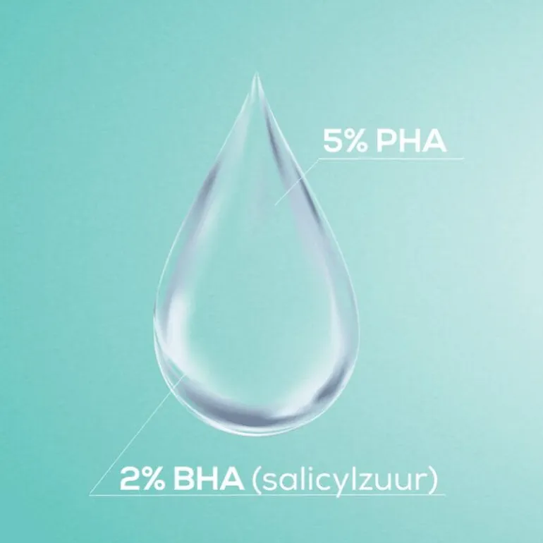 1. Exfolieert – De effectieve combinatie van BHA en PHA exfolieert mild en helpt dode huidcellen te verwijderen en de huidtextuur te verbeteren.2. Zuivert – BHA werkt dieper in de poriën en lost daar een teveel aan vuil en talg op. Het helpt zo tegen verstopte poriën en bij het verminderen van puistjes, mee-eters en onzuiverheden. 3. Kalmeert – Panthenol (provitamine B5) kalmeert irritaties en helpt roodheid verminderen terwijl betaïne en glycerine de huid hydrateren. Samen beschermen ze de huidbarrière tegen overmatig exfoliëren en dragen ze bij aan een goede vochtbalans van de huid.