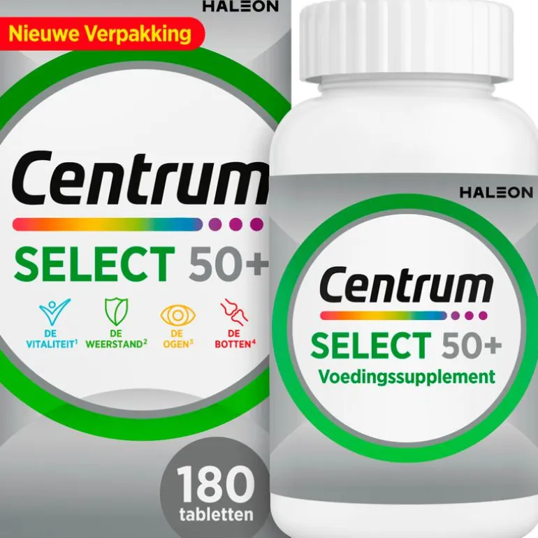 Centrum Select 50+ is een compleet multivitamine & mineralen supplement, speciaal ontwikkeld om de voedingsbehoeften van mannen en vrouwen vanaf 50 jaar te ondersteunen. Naar mate we ouder worden, veranderen onze voedingsbehoeften. Zo heeft je lichaam minder energie uit voeding nodig voor de opbouw en het onderhoud van het lichaam, maar worden bepaalde voedingsstoffen steeds belangrijker. Centrum Select 50+ bevat belangrijke micronutriënten om de vitaliteit, weerstand, ogen en botten te ondersteunen. Bevat vitamine B6, B12 en ijzer ter ondersteuning van het energieniveau en bevat vitamine C, seleen en zink om het immuunsysteem te ondersteunen. De conditie van het oog wordt ondersteund door het gehalte aan vitamine A en B2 en de botten worden ondersteund door de calcium, vitamine D en K die aan de formule zijn toegevoegd.Gluten- en lactosevrij en geschikt voor diabetici.