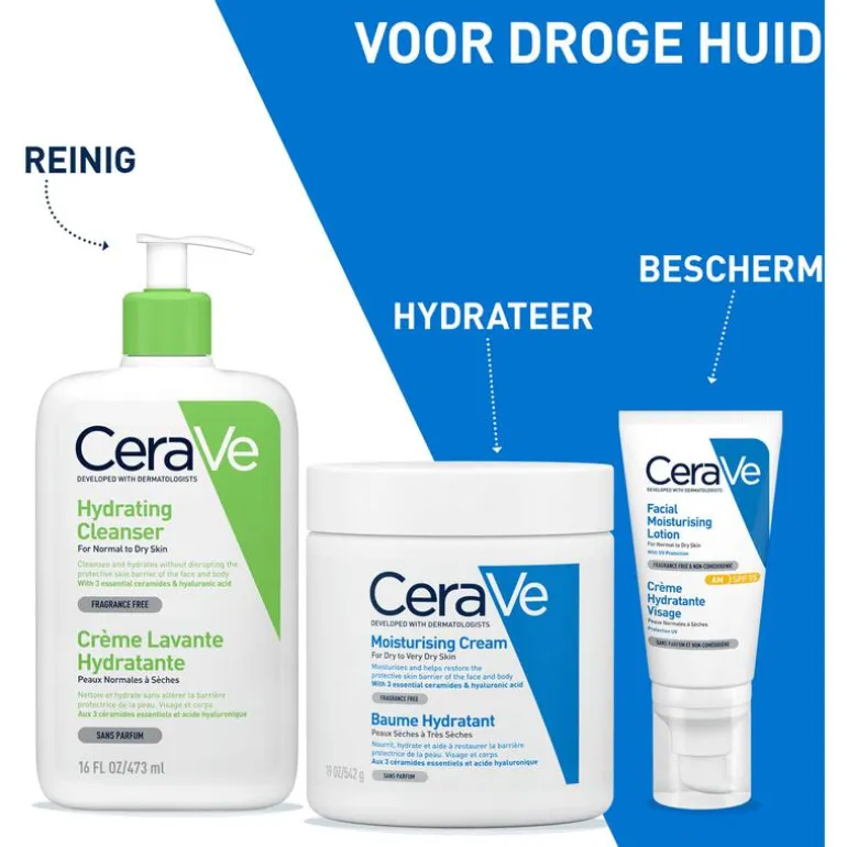 Niet-schuimende textuur, reinigt en hydrateert de normale tot droge huid. Een hydraterende reiniger die de onzuiverheden, make-up en ander vuiligheid verwijdert van het gezicht en lichaam. Het is belangrijk om een formule te kiezen die de huidbarrière beschermt en respecteert, zonder deze uit te drogen. De hydraterende reinigingscrème van CeraVe is een zachte reiniger, die door de aanwezigheid van de ceramiden zorgt voor een versterking van de huidbarrière en laat de huid toe om zijn natuurlijke vocht vast te houden.