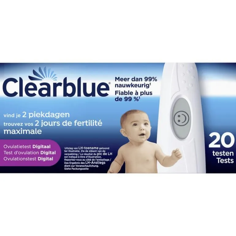 Clomifeencitraat is niet van invloed op de testen, maar kan gevolgen hebben voor de lengte van uw cyclus, en dus het moment waarop u moet testen. Mogelijk moet u doorgaan met testen met een nieuwe verpakking. U kunt misleidende resultaten krijgen als u zwanger bent, recent zwanger bent geweest, de menopauze hebt bereikt, een verminderde lever- of nierfunctie hebt of polycysteus-ovariumsyndroom (PCOS) hebt. Lees altijd eerst de instructies van de fabrikant van uw medicijnen voordat u een test uitvoert. U kunt een misleidende uitslag krijgen als u vruchtbaarheidsmiddelen gebruikt die luteïniserend hormoon (LH) of humaan choriongonadotrofine bevatten, of als u antibiotica gebruikt die tetracyclines bevatten. Clomifeencitraat heeft geen invloed op de tests. Als u onlangs bent gestopt met het gebruik van hormonale anticonceptie, kunnen uw cycli onregelmatig zijn, dus u kunt misschien beter wachten totdat u twee cycli hebt gehad voordat u begint met testen.Omdat prenatale zorg zeer belangrijk is voor de gezondheid van een baby, raden we aan dat u uw arts raadpleegt voordat u probeert zwanger te worden. Raadpleeg uw arts als u medicatie neemt of een medische aandoening hebt voordat u een zwangerschap plant. Als u een medisch gediagnosticeerd vruchtbaarheidsprobleem hebt, vraag dan uw arts of deze test voor u geschikt is en bespreek eventuele onverwachte resultaten met uw arts.Als u jonger bent dan 35 jaar en niet zwanger bent geworden, raden wij u aan om na 12 maanden naar uw arts te gaan. Als u ouder bent dan 35 jaar, raadpleeg dan uw arts als u na 6 maanden niet zwanger bent geworden, en raadpleeg meteen uw arts als u ouder bent dan 40.Dit digitale IVD-apparaat voldoet aan de vereisten voor emissie en immuniteit van EN 61326-2-6. De EMC-tegenmaatregelen die in dit elektronische instrument zijn gebruikt, geven een redelijke bescherming tegen de effecten van elektromagnetische interferentie die vaak in de thuisomgeving voorkomt. De volgende preventieve waarschuwingen zijn van toepassing op apparatuur die voldoet aan EN 61326-2-6.a) Gebruik van dit instrument in een droge omgeving, in het bijzonder wanneer hier synthetische materialen aanwezig zijn (synthetische kleding, tapijten etc.) kan schadelijke statische ontladingen veroorzaken die tot foutieve uitslagen kunnen leiden.b) Gebruik dit instrument niet in de buurt van bronnen met sterke elektromagnetische straling (bijvoorbeeld mobiele telefoons), aangezien deze de juiste werking van de test kunnen verstoren.Dit is een medisch hulpmiddel. Lees aandachtig de instructies voor gebruik.SPD Swiss Precision Diagnostics GmbH, Route de St Georges 47, 1213 Petit-Lancy, Genève, Zwitserland. 0800 394 9031. www.clearblue.com. Naam en adres van de geautoriseerde vertegenwoordiger: MDSS GmbH, Schiffgraben 41 Hannover 30175, Duitsland: [email protected].