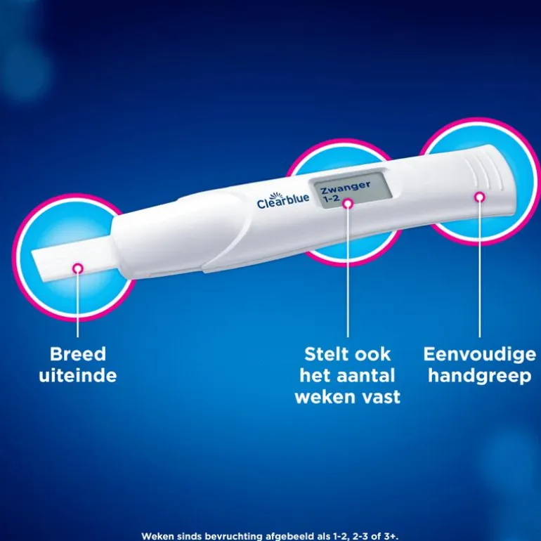 De Clearblue Zwangerschapstest Digitaal met Wekenindicator is de eerste en enige test die de duur van de zwangerschap even nauwkeurig bepaalt als een echo-onderzoek (1). De Smart Dual Sensor vertelt je niet alleen in woorden op het digitale display of je zwanger bent of niet, maar ook hoe lang al (2). Het aantal weken sinds de bevruchting wordt weergegeven als 1-2, 2-3 of 3+.