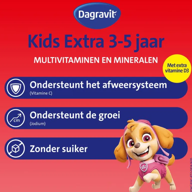 Dagravit Kids Extra is een voedingssupplement voor kinderen van 3-5 jaar in de vorm van kauwtabletten met frambozensmaak. Als aanvulling op je dagelijkse voeding bevat Dagravit Kids Extra belangrijke multivitaminen en mineralen. Vitamine A, C en de mineralen zink en selenium dragen bij aan het normaal functioneren van het immuunsysteem. Elke dag en in elk seizoen is het belangrijk om over een sterk immuunsysteem te blijven beschikken. Dit systeem zorgt voor de nodige weerstand tegen invloeden van buitenaf. Vitamine D ondersteunt de groei en ontwikkeling van het beendergestel bij kinderen. Daarnaast draagt jodium bij tot normale groei van kinderen. Bovendien bevat Dagravit Kids Extra voor de dagelijkse energiehuishouding en mentale prestaties ook vitamine B1, B3 en B5. Vitamine C en het mineraal jodium activeren de natuurlijke energie in het lichaam. Daarnaast zijn vitamine B11 en B12 goed voor de leerprestaties, die op school geleverd moeten worden. Met stoer Paw Patrol karakter.