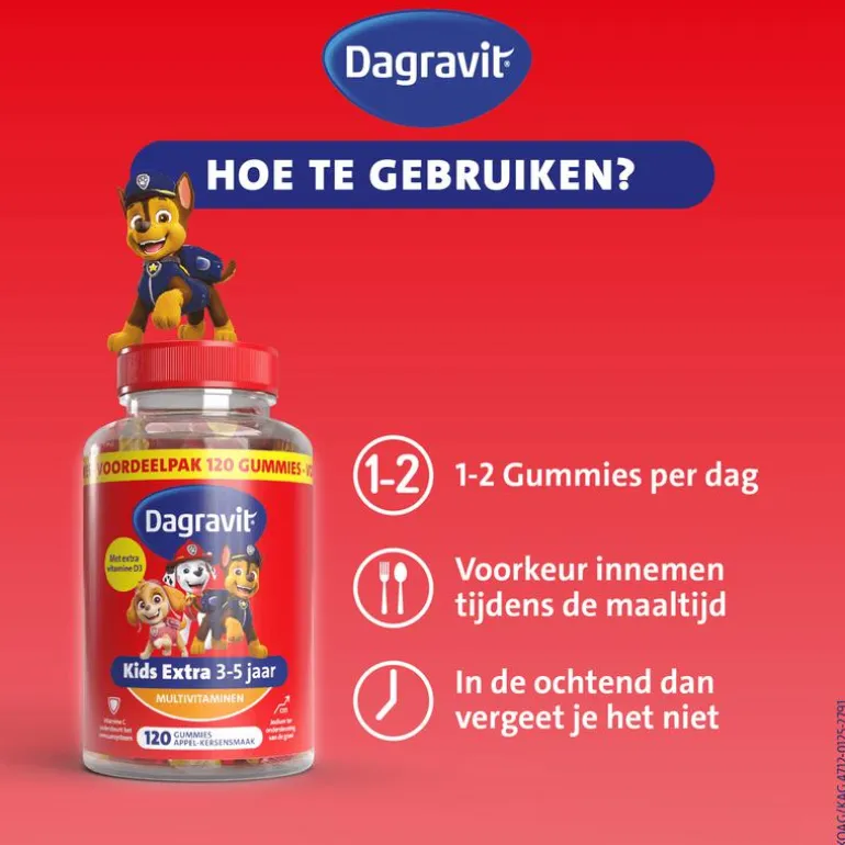 Gebruiksaanwijzing en aanbevolen gebruik per dag: Kinderen vanaf 3 jaar dagelijks 1-2 gummies. Bij voorkeur innemen tijdens de maaltijd. De aanbevolen dagelijkse dosering niet overschrijden. Dit voedingssupplement is niet geschikt voor kinderen onder de 3 jaar. Een gevarieerde, evenwichtige voeding en een gezonde levensstijl zijn belangrijk. Voedingssupplementen zijn geen vervanging van gevarieerde voeding. Dagravit Kids-Xtra Multivitaminen Gummies bevat geen kunstmatige kleur- en smaakstoffen.