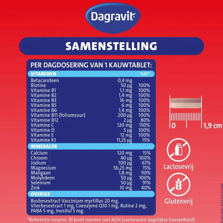 Gebruiksaanwijzing en aanbevolen gebruik per dag: Volwassenen: 1 kauwtablet per dag. Bij voorkeur innemen tijdens of na de maaltijd. De aanbevolen dagelijkse dosering niet overschrijden. Dit voedingssupplement is niet geschikt voor gebruik door kinderen onder 12 jaar. Overmatig gebruik kan een laxerend effect hebben.Dagravit Totaal 30 Weerstand & Energie bevat geen conserveermiddelen.