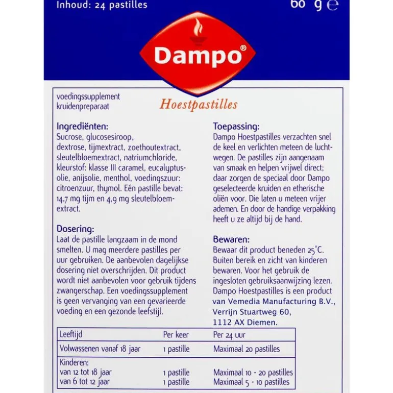 Dampo Hoestpastilles verzachten snel de keel en verlichten de luchtwegen. De pastilles zijn aangenaam van smaak en helpen snel: daar zijn de speciaal door Dampo geselecteerde kruiden en etherische oliën voor. Deze laten u snel vrijer ademen. Dampo Hoestpastilles zijn verkrijgbaar in handige doosjes met 24 pastilles in handige doordrukstrips.
