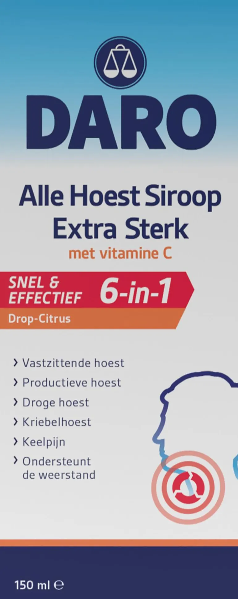 Daro Alle Hoest Siroop Extra Sterk Met vitamine C bevat een dubbele hoeveelheid werkzame stof, werkt extra krachtig bij alle soorten hoest en keelpijn.