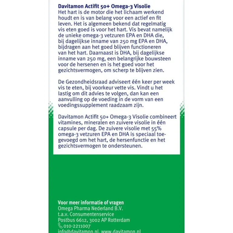 Davitamon Actifit 50+ Omega-3 Visolie is speciaal ontwikkeld voor volwassenen vanaf 50 jaar en voorziet in de dagelijkse aanvulling van vitamines en mineralen. Hierdoor is Davitamon Actifit 50+ Omega-3: