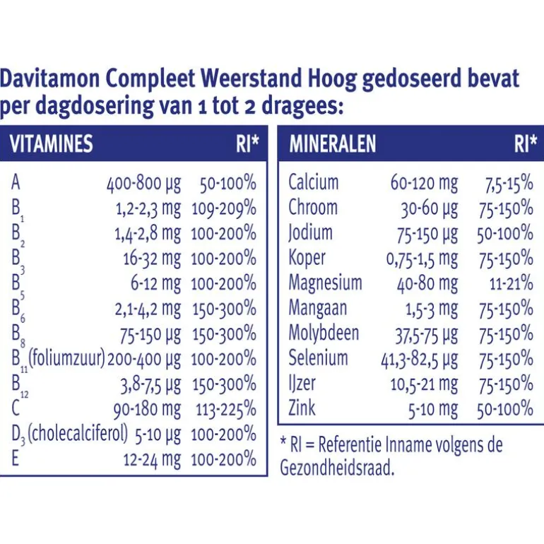 Wanneer je je vermoeid of futloos voelt dragen vitamine B2, B3,B5, B6, B11 en C bij aan extra energie bij. Daarnaast bieden vitamine B11 (foliumzuur) en zink ondersteuning in stress-situaties. Davitamon Compleet Weerstand Forte dragees bevatten een extra hoge dosering van deze vitaminen en mineralen bij inname van 2 dragees. Zo helpt Davitamon Compleet Weerstand Forte je om opnieuw fit te worden.