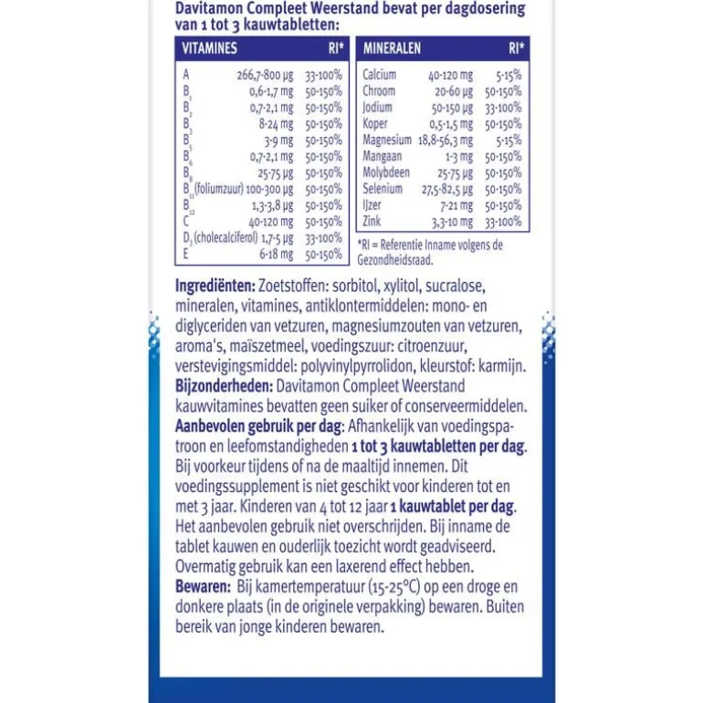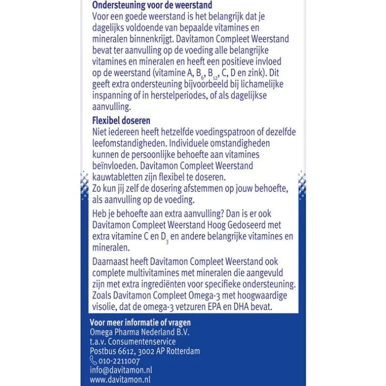 Je lichaam heeft dagelijks vitamines en mineralen nodig om goed te blijven functioneren en een goede gezondheid in stand te houden. Gezond en gevarieerd eten is de basis om voldoende vitamines en mineralen binnen te krijgen. Maar soms kan aanvulling in de vorm van een voedingssupplement, zoals Davitamon Compleet Weerstand Kauwvitamines, raadzaam zijn.