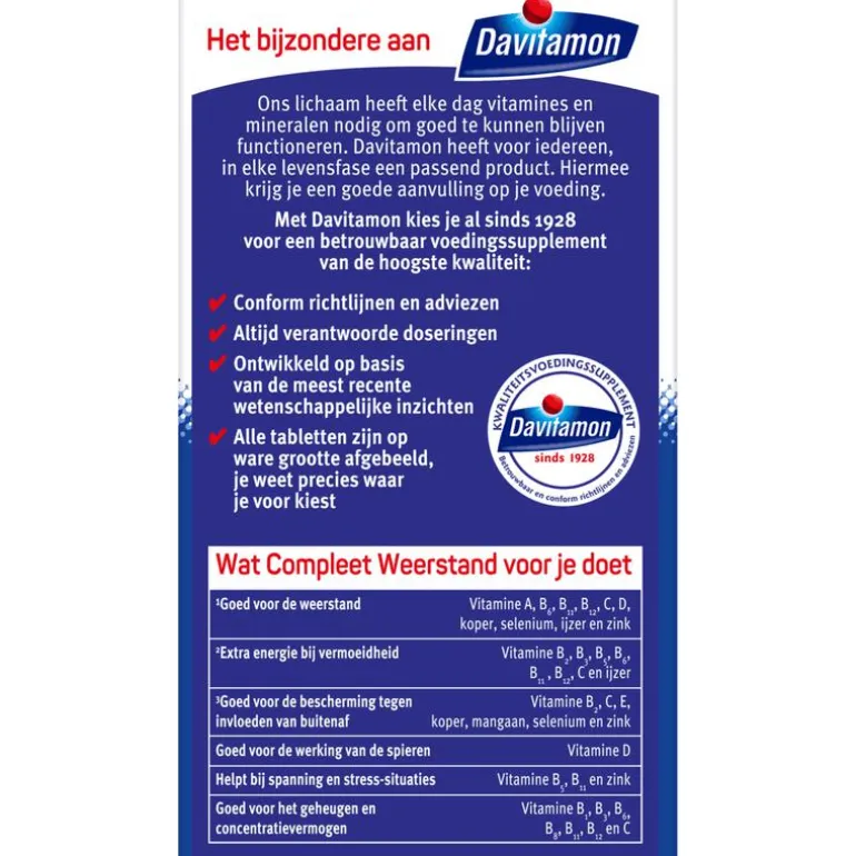 Om goed te kunnen blijven functioneren heeft ons lichaam elke dag vitamines en mineralen nodig. Daarom heeft Davitamon voor iedereen, in elke levensfase, een ander product. Zo krijg jij de juiste aanvulling op je voeding. Davitamon biedt al sinds 1928 betrouwbare voedingssupplementen aan van de hoogste kwaliteit.