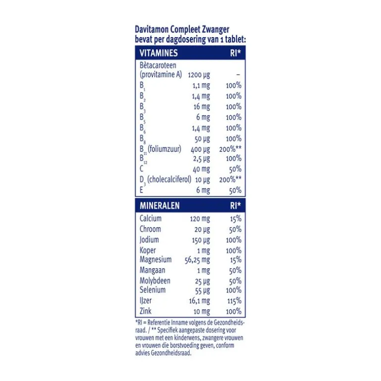 DAVITAMON COMPLEET ZWANGER is een voedingssupplement speciaal afgestemd op de behoefte van je lichaam als aanstaande moeder. Davitamon Compleet Mama bevat extra foliumzuur, 200% van de ADH, en draagt hierdoor bij aan de ontwikkeling van de baby en de vorming van de placenta. De tabletten bevatten daarnaast ook andere vitamines en mineralen en zijn hierdoor: • Goed voor de WEERSTAND (bètacaroteen, vitamine B6, B11, B12, C, D, koper, selenium, ijzer en zink)• Goed voor de VRUCHTBAARHEID (zink)• Goed voor het IJZERGEHALTE in het bloed (bètacaroteen, vitamine B2 en C)FOLIUMZUUR DRAAGT BIJ AAN DE ONTWIKKELING VAN DE BABYDavitamon Compleet Mama bevat extra foliumzuur, 200% van de ADH, en draagt hierdoor bij aan de ontwikkeling van de baby en de vorming van de placenta. Daarnaast helpt foliumzuur bij de vorming van rode bloedcellen en draagt het bij aan de groei van het ongeboren kind. Het is belangrijk dat er vanaf het begin van de zwangerschap voldoende foliumzuur in je lichaam aanwezig is.ONTDEK DE VOORDELEN:• Bevat foliumzuur (draagt bij aan de ontwikkeling van de baby)• Geen suiker, conserveermiddelen of aroma’s• Veel vitamine D3 (goed voor de weerstand)DAVITAMON, SINDS 1928Om goed te kunnen blijven functioneren heeft ons lichaam elke dag vitamines en mineralen nodig. Daarom heeft Davitamon voor iedereen, in elke levensfase, een ander product. Zo krijg jij de juiste aanvulling op je voeding. Davitamon biedt al sinds 1928 betrouwbare voedingssupplementen aan van de hoogste kwaliteit.Zwanger worden doe je niet alleen, ook de conditie van de man dient in goede staat te zijn. Davitamon heeft , als aanvulling op de voeding, een multivitamine ontwikkeld speciaal voor de man! Davitamon Compleet Man is een breed, uitgebalanceerd multivitamine en mineralen complex speciaal afgestemd op de behoeften van volwassen mannen. Selenium en zink zijn goed voor de vruchtbaarheid van de man en zijn GOED VOOR DE KWALITEIT VAN HET SPERMA. Zink draagt bij aan de beweeglijkheid en productie van de zaadcellen en magnesium in DAVITAMON COMPLEET MAN draagt bij aan een goede werking van spieren. KLIK HIER VOOR DAVITAMON COMPLEET MAN