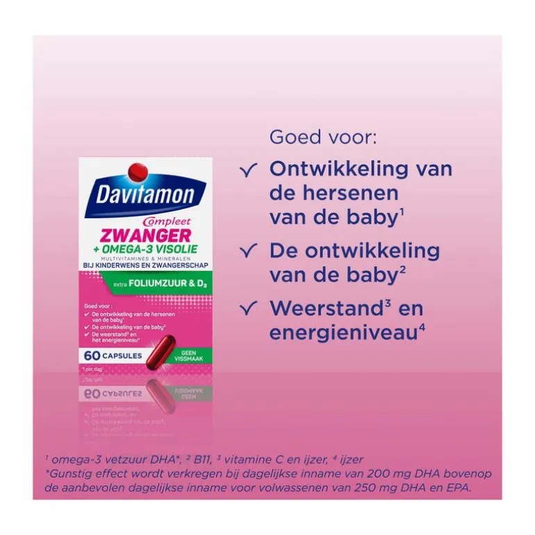 Davitamon Compleet Zwanger + Omega-3 Visolie is speciaal voor vrouwen met een zwangerschapswens, die zwanger zijn of die borstvoeding geven. Het unieke van dit product is onder andere dat het geen suikers, conserveermiddelen of aroma’s bevat. Deze capsules bevatten naast de vitamines en mineralen, extra foliumzuur, vitamine D3 en omega-3 vetzuur DHA. Wanneer je zwanger wilt worden, is het goed om eens je leefstijl goed onder de loep te nemen. En dat is goed, want gezonde gewoontes hebben een positieve invloed op een zwangerschap en een gezonde baby. Ook vitamines en mineralen dragen daar een steentje aan bij. Zo is foliumzuur (vitamine B11) belangrijk voor de groei van het ongeboren kind.