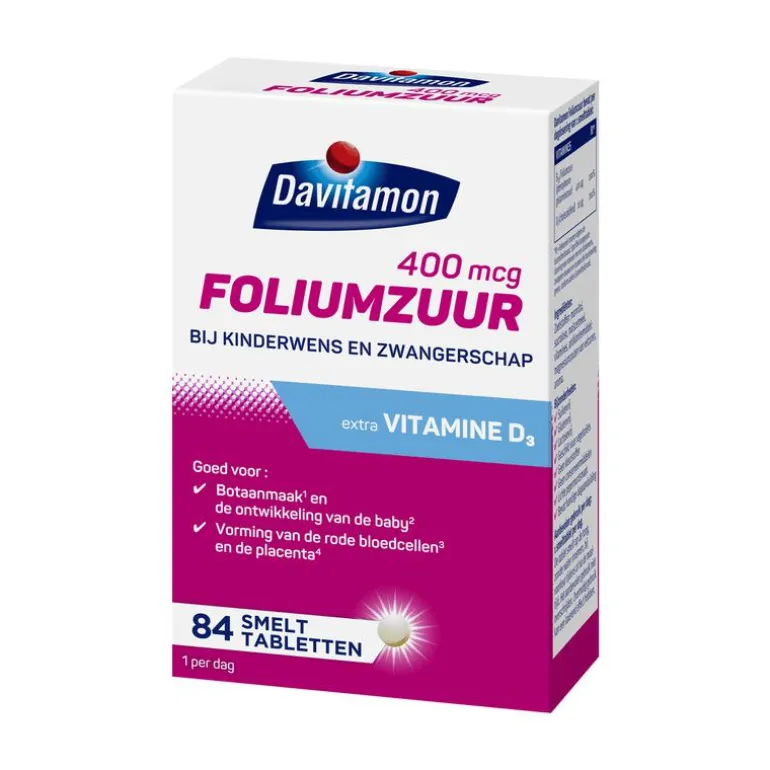 Davitamon Foliumzuur Vitamine D3 is speciaal ontwikkeld voor vrouwen die zwanger willen worden of zwanger zijn. Het voorziet in de dagelijkse aanbevolen hoeveelheid extra foliumzuur en vitamine D3 zoals geadviseerd wordt door de Gezondheidsraad. In het verdere verloop van de zwangerschap blijft de behoefte aan foliumzuur verhoogd ter ondersteuning van de ontwikkeling van de baby en om bij te dragen aan de vorming van de placenta en de rode bloedcellen. Wanneer je zwanger bent adviseert de Gezondheidsraad om naast de normale voeding dagelijks 10 microgram extra vitamine D in te nemen. De blister bevat een handige dag aanduiding waardoor het vergeten van een smeltablet niet snel zal voorkomen.