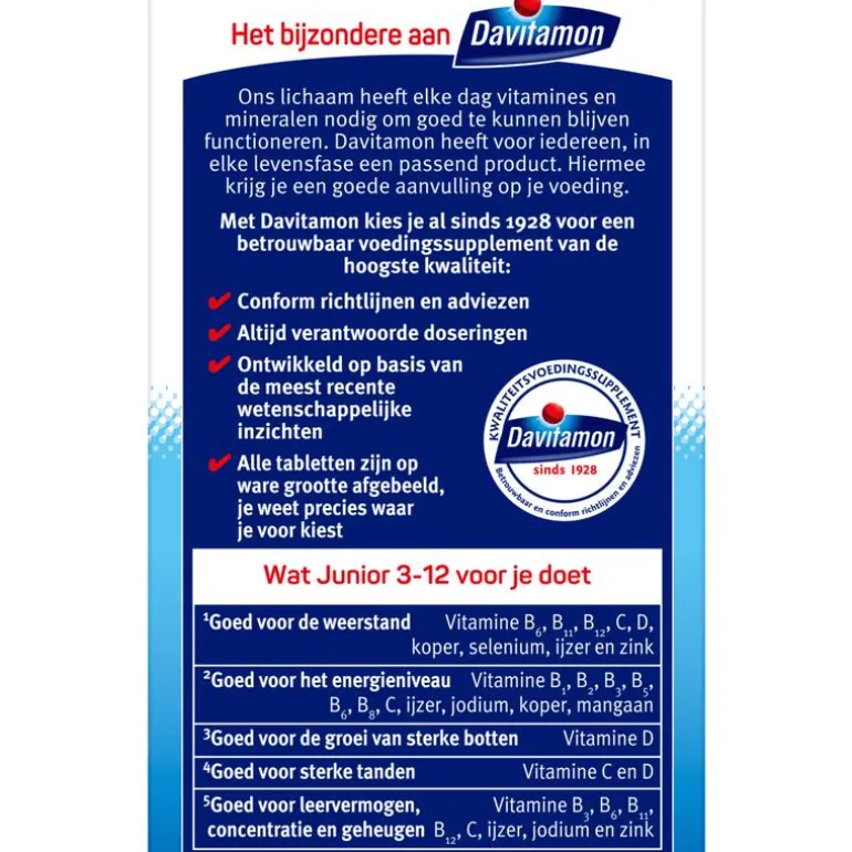Om goed te kunnen blijven functioneren heeft ons lichaam elke dag vitamines en mineralen nodig. Daarom heeft Davitamon voor iedereen, in elke levensfase, een ander product. Zo krijg jij de juiste aanvulling op je voeding. Davitamon biedt al sinds 1928 betrouwbare voedingssupplementen aan van de hoogste kwaliteit.