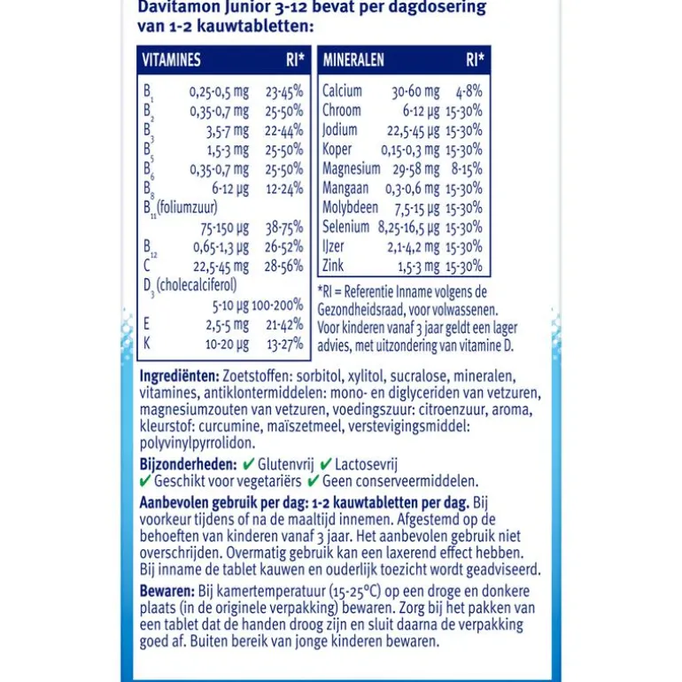 Davitamon Junior 3-12 Kauwvitamines Banaan is afgestemd op de specifieke behoeften van kinderen vanaf 3 jaar. Omdat groeien niet vanzelf gaat, is het belangrijk dat kinderen voldoende vitamines en mineralen binnen krijgen. Een voedingssupplement kan hierbij helpen. Davitamon Junior KauwVitamines Banaan bevat veel vitamine D3, 100% van de ADH, en is hierdoor: