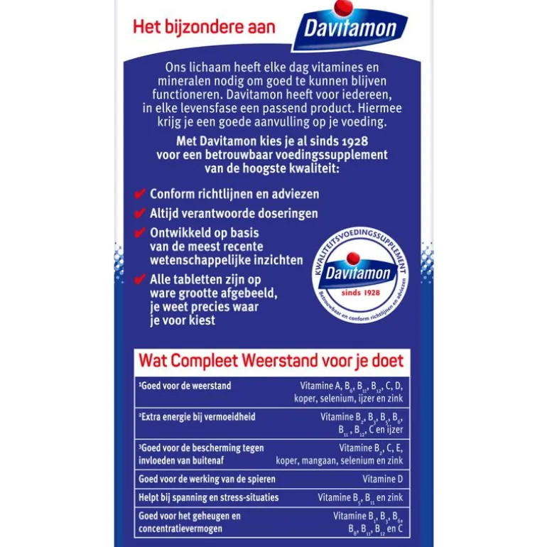 Om goed te kunnen blijven functioneren heeft ons lichaam elke dag vitamines en mineralen nodig. Daarom heeft Davitamon voor iedereen, in elke levensfase, een ander product. Zo krijg jij de juiste aanvulling op je voeding. Davitamon biedt al sinds 1928 betrouwbare voedingssupplementen aan van de hoogste kwaliteit.
