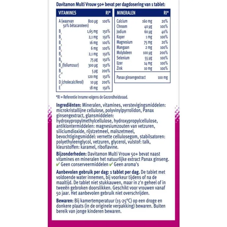 Aanbevolen gebruik: 1 tablet per dag. De tablet met voldoende water innemen, bij voorkeur tijdens of na de maaltijd. De tablet niet stukkauwen, maar in z’n geheel of in tweeën gebroken doorslikken. Geschikt voor vrouwen vanaf 50 jaar. Het aanbevolen gebruik niet overschrijden.