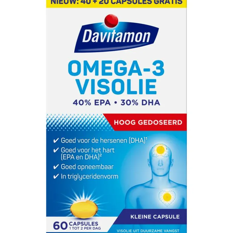 DAVITAMON OMEGA-3 VISOLIEDavitamon Omega-3 Visolie is hooggedoseerd en bevat naast de natuurlijke Omega-3 visolie ook vitamine E. Het omega-3 vetzuur DHA is goed voor de hersenfunctie en het gezichtsvermogen*. Het gunstige effect wordt verkregen bij een dagelijkse inname van 250 mg DHA. Daarnaast hebben de Omega-3 vetzuren EPA en DHA een gunstige werking op het hart**. Het effect wordt verkregen bij een dagelijkse inname van 250 mg EPA en DHA.DEZE VISOLIE IS:1. Goed voor de hersenen*2. Goed voor het hart**3. Goed voor het gezichtsvermogen*Deze visolie bevat een hoge dosering aan omega-3 vetzuren EPA en DHA.ONTDEK DE VOORDELEN:• Suikervrij, glutenvrij en lactosevrij• Geheel vrij van conserveermiddelen• Visolie uit duurzame vangst• Deze visolie is getest op zuiverheidINGREDIËNTEN Visolie, gelatine (rund), geleermiddel: glycerol, water, vitamine EBelangrijk: De gezondheidsraad adviseert om 1 keer per week vis te eten, bij voorkeur vette vis en niet gefrituurd. Het kan soms lastig zijn om dit advies te volgen, dan kan een aanvulling zoals de Davitamon Omega-3 Visolie op de voeding raadzaam zijn.AANBEVOLEN GEBRUIK: Volwassenen dienen dagelijks 1-2 capsules in te nemen en kinderen vanaf 6 jaar mogen 1 capsule per dag innemen. De capsule met voldoende water innemen tijdens of vlak na de maaltijd. De capsule in zijn geheel doorslikken en het aanbevolen gebruik niet overschrijden.Bij kamertemperatuur bewaren in originele verpakking. Buiten bereik van jonge kinderen bewaren.* Bij dagelijkse inname van 250 mg DHA**Bij dagelijkse inname van 250 mg DHA en EPA*** Gemaakt met ingrediënten van 100% natuurlijke oorsprongDAVITAMON, SINDS 1928Om goed te kunnen blijven functioneren heeft ons lichaam elke dag vitamines en mineralen nodig. Daarom heeft Davitamon voor iedereen, in elke levensfase, een ander product. Zo krijg jij de juiste aanvulling op je voeding. Davitamon biedt al sinds 1928 betrouwbare voedingssupplementen aan van de hoogste kwalisteit.