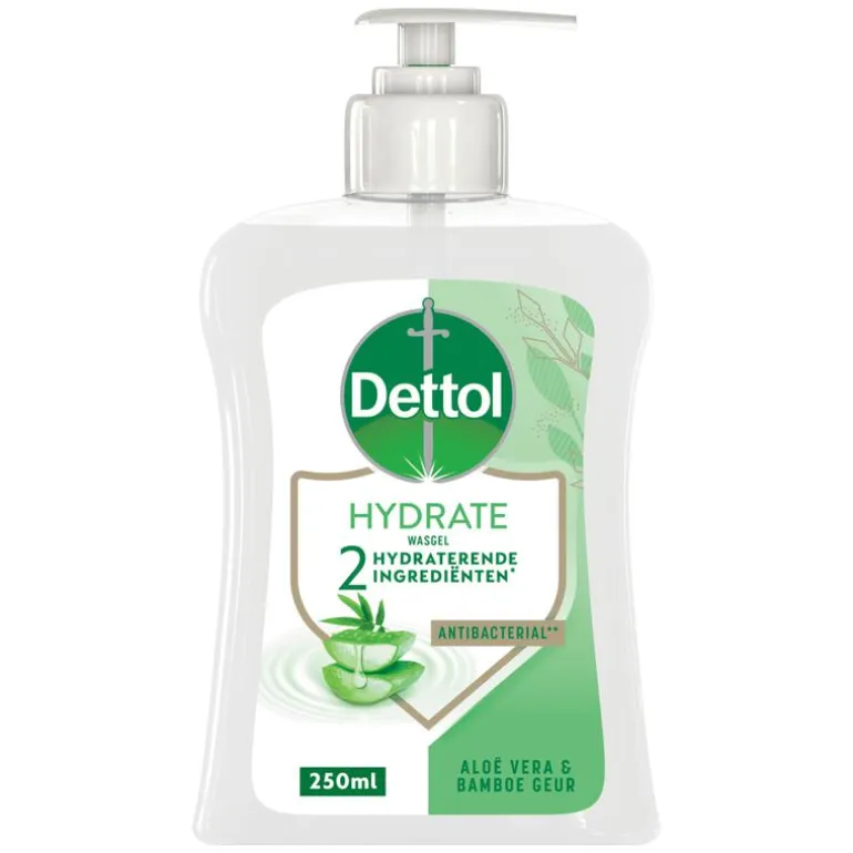 Dettol Wasgel Aloë Vera & Bamboe geur (Hydrate) is verrijkt met twee hydraterende* natuurlijke ingrediënten, die je huid intensief voeden. Deze wasgel is antibacterieel** en helpt de verspreiding van bacteriën te voorkomen. De dermatologisch geteste formule behoudt de natuurlijke pH-waarde van je huid, waardoor het geschikt is voor alle huidtypes.