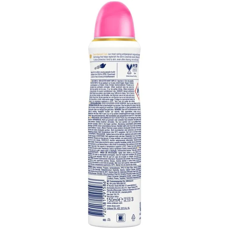 Dove Advanced Care Invisible Care Anti-Transpirant Deodorant Spray met de lekkere geur van waterlelie en rozen beschermt tegen zweet, laat geen witte strepen na op kleding én is lief voor je oksels. Het Advanced Care assortiment van Dove met de verbeterde formule met Pro-Ceramide serum maakt deel uit van de meest verzorgende lijn van Dove. De spray biedt onmiddellijke verlichting na het scheren, helpt de okselhuid te herstellen en beschermt tot 72 uur tegen zweet en lichaamsgeur. Bovendien bevat deze milde formule 0% alcohol. De hele dag een fris en verzorgd gevoel – wat de dag je ook brengt!