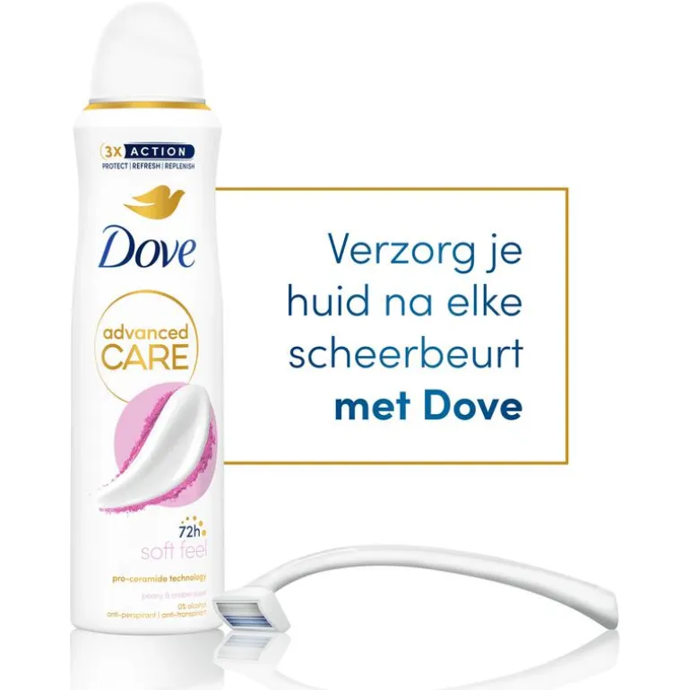 Dove Advanced Care Soft Feel Anti-Transpirant Deodorant Spray verzorgt je okselhuid optimaal waardoor deze voelbaar zachter aanvoelt en zichtbaar gladder is. Soft Feel heeft een heerlijk warme, luxueuze geur van pioenrozen en amber. De Dove Advanced Care anti-transpiranten maken deel uit van de meest verzorgende lijn van Dove, met de verbeterde gepatenteerde formule zijn ze zacht voor de huid, zelfs na het scheren. Het Advanced Care assortiment van Dove biedt met de Triple Moisturising technologie 72 uur bescherming tegen zweet.