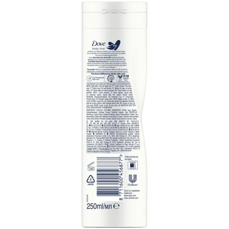 Met Dove Body Love Essential Care Bodylotion verander je je dagelijkse huidverzorging in een ontspanmomentje. Bij Dove geloven we in ‘Body Love’. Dat betekent dat we voor ons lichaam zorgen en wat liefde tonen, ongeacht hoe we over ons lichaam denken. Bescherming tegen een droge huid begint met je huid de zorg te geven die het verdient. Dove Essential Care Bodylotion bevat het unieke Ceramide Restoring Serum. Deze mix van ingrediënten werkt samen met je lichaam om natuurlijke ceramiden te creëren. Dit helpt het huidoppervlak van binnenuit af te sluiten en de barrière te versterken om vochtverlies te voorkomen. De bodylotion trekt snel in, voedt de huid diep* en geeft tot 48 uur hydratatie. De bodylotion is ook dermatologisch getest. Deze rijke bodylotion vermindert zichtbare droogheid na één keer gebruik. Voor een stralende, zachte en gladde huid, die lang verzorgd blijft. Essentiële zorg, speciaal voor jou.